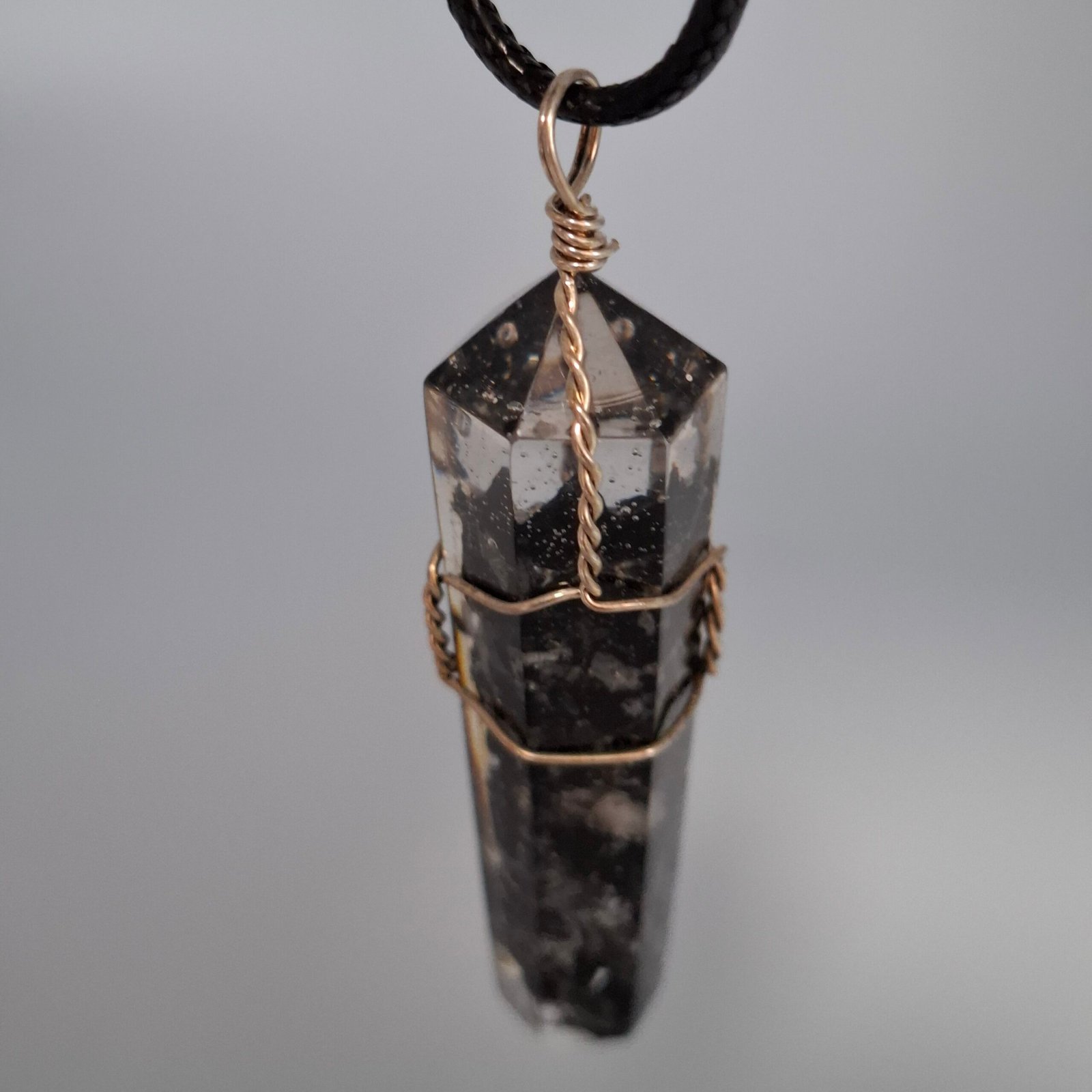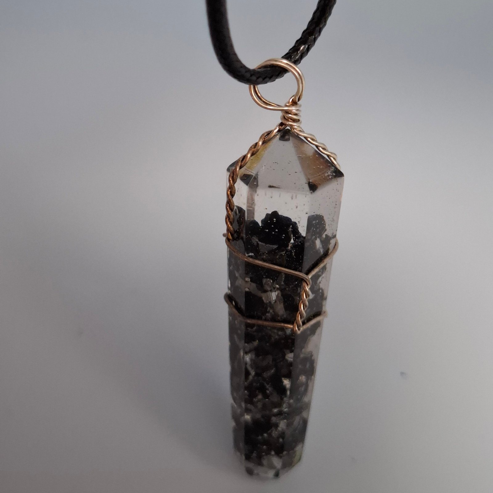 Colgante de resina y piedras de Shungita encapsulada, biterminada, con material de latón en baño de plata.