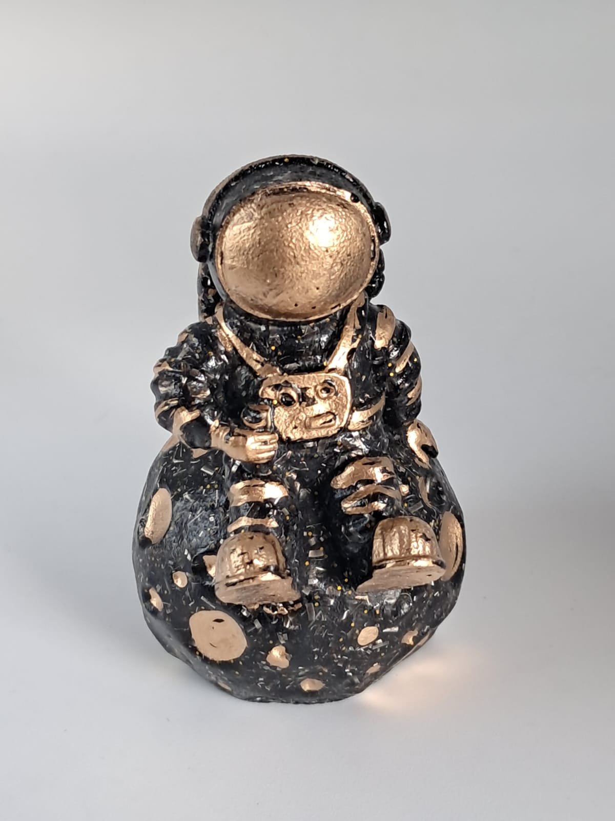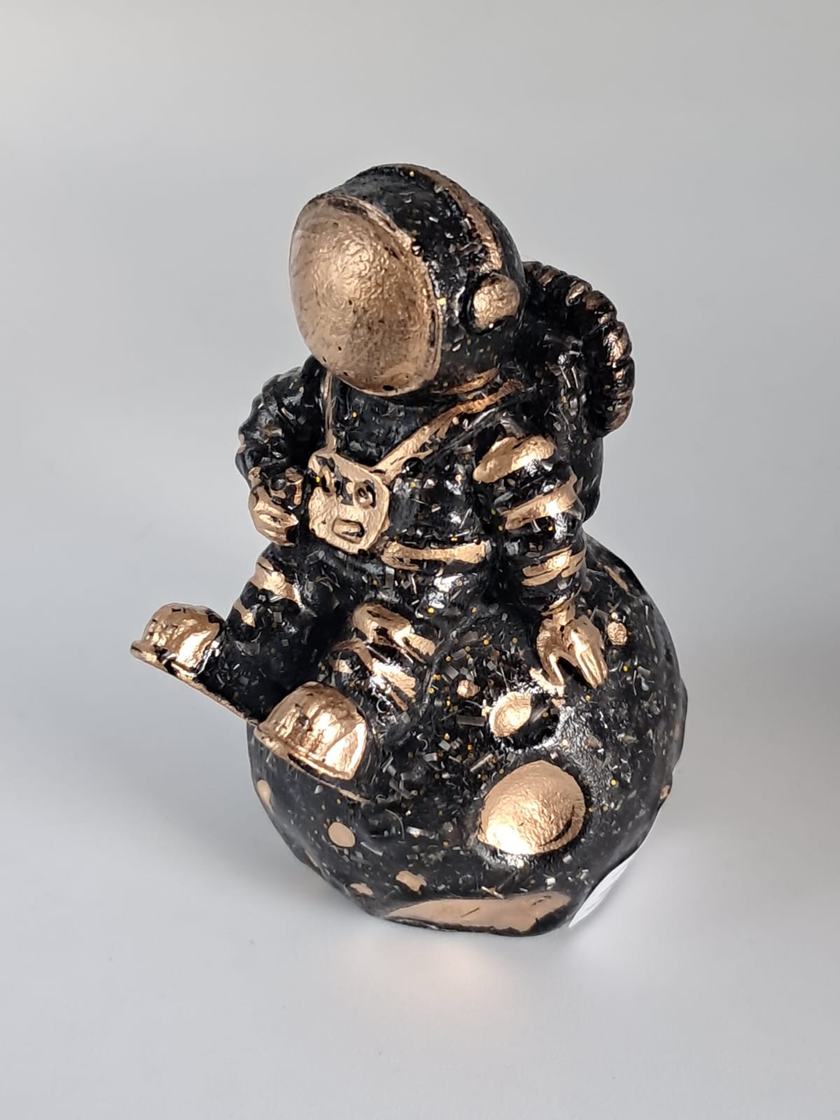 Electronite con forma de astronauta sentado sobre un planeta. Mide 8 cm de altura por 5 cm de ancho. Esta electronite está compuesta de viruta de aluminio, cuarzos naturales, termoretráctil, sal de Rochelle o Tartrato de Potasio y Sodio Tetrahidratado y resina poliéster.