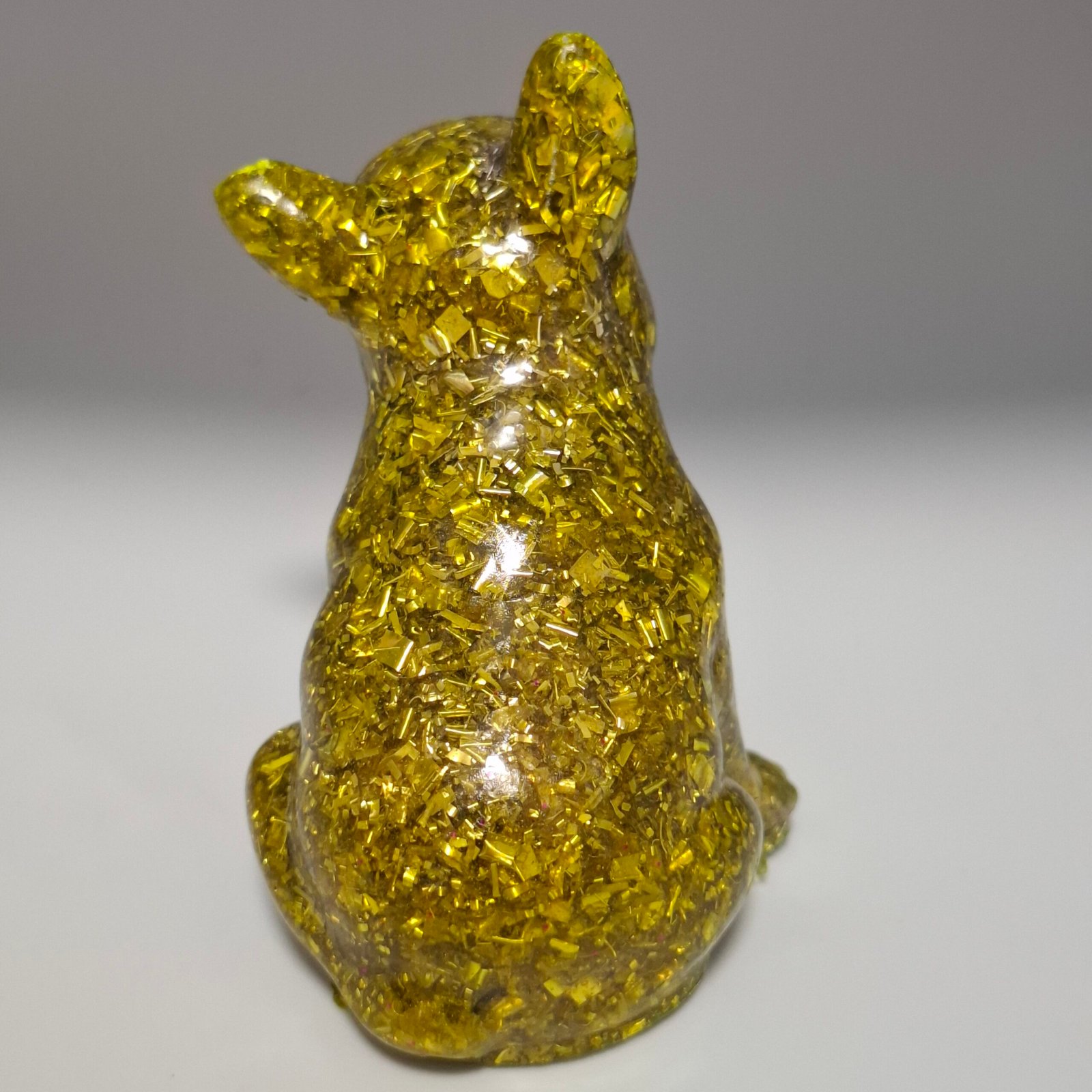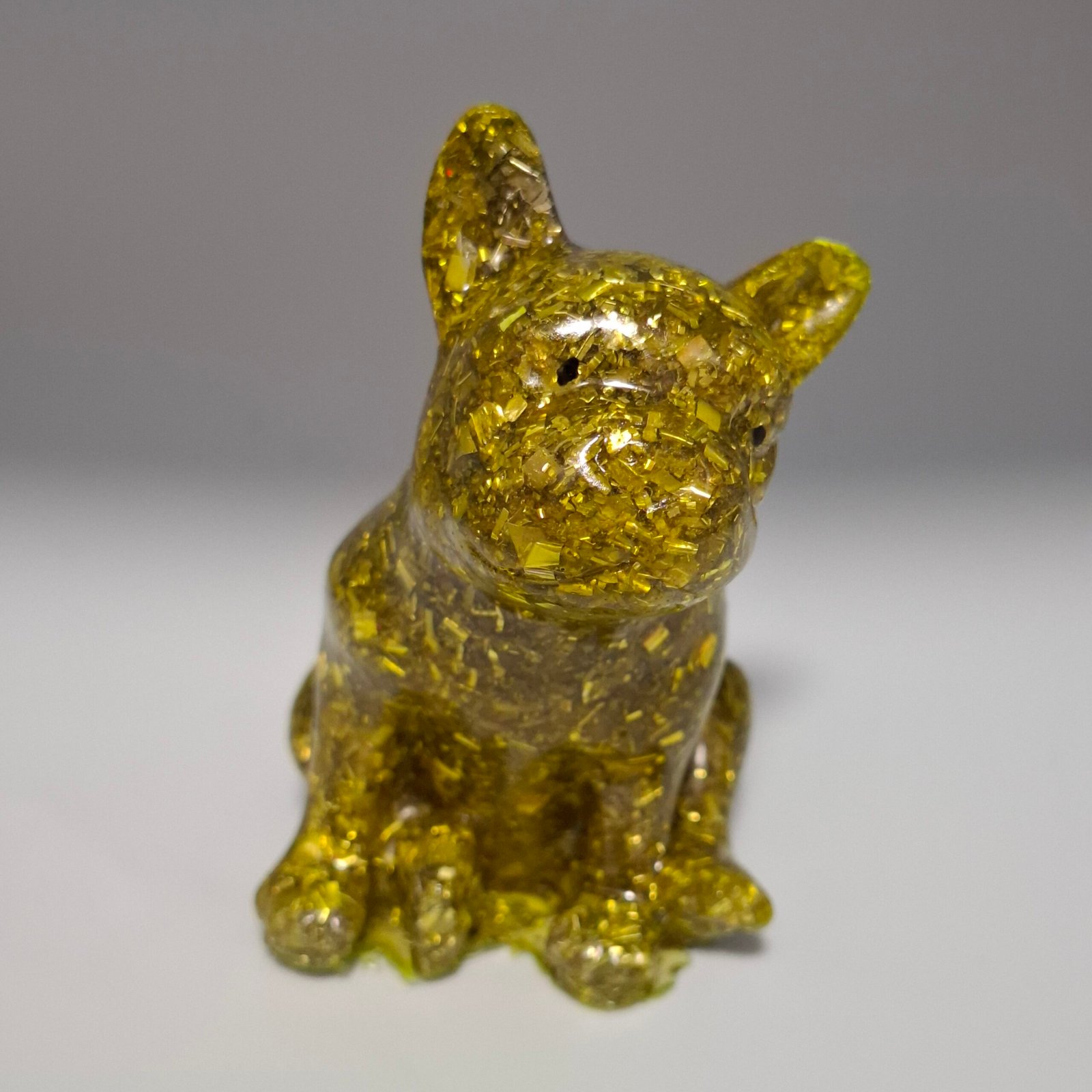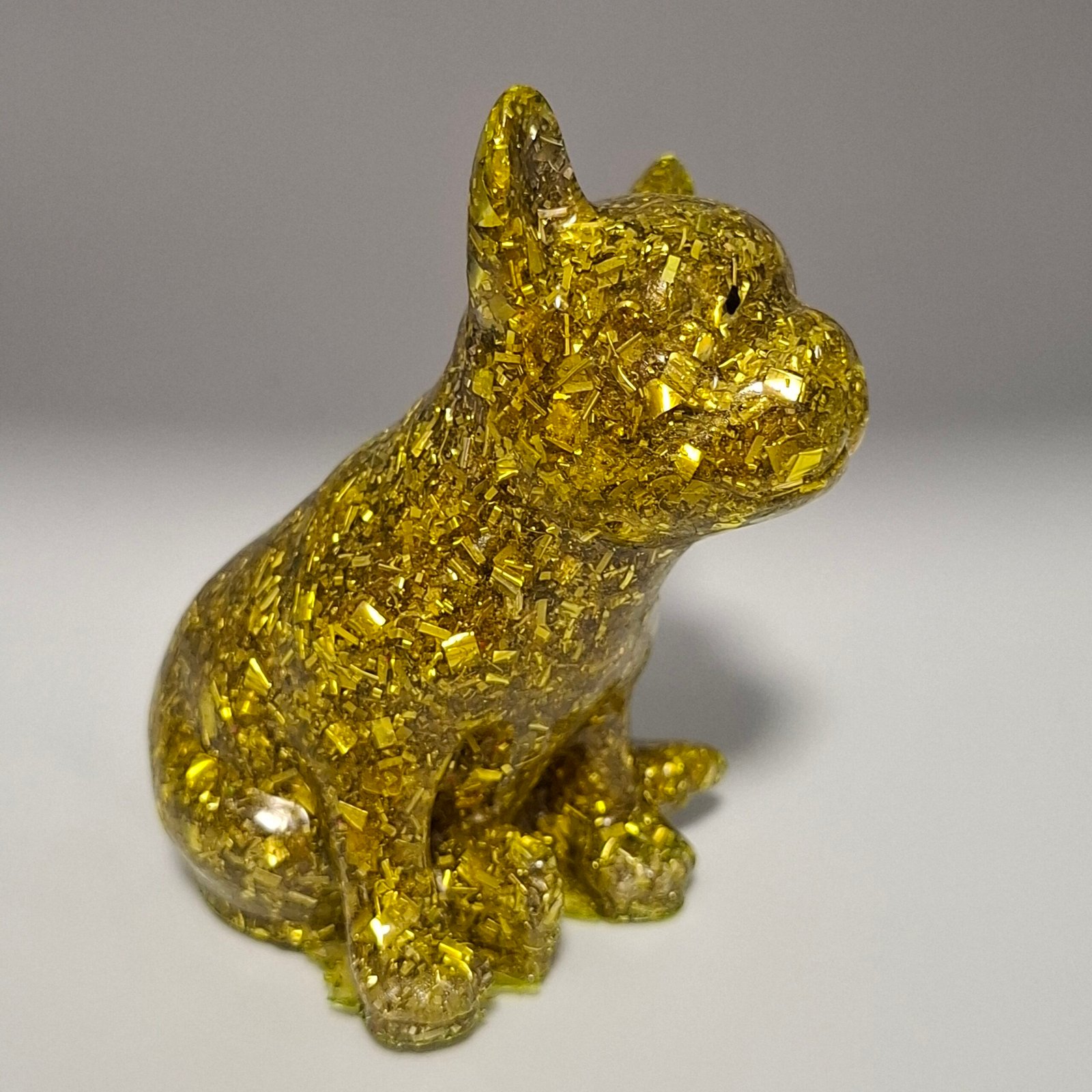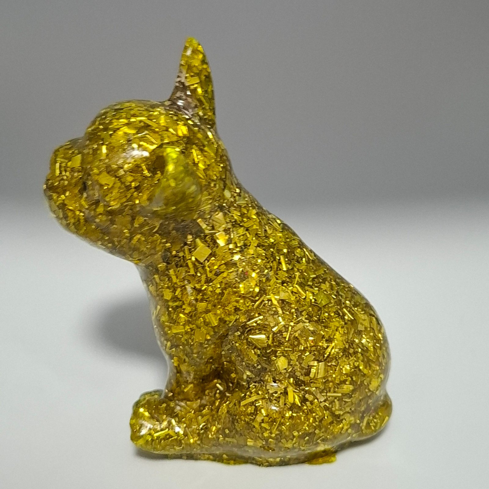 Electronite en formato de Bulldog francés. Mide 6,5cm de altura por 3,7 cm de ancho. compuesta de viruta de aluminio, cuarzo natural, termoretráctil, sal de Rochelle o Tartrato de Potasio y Sodio Tetrahidratado, pigmento para resina y resina poliéster.