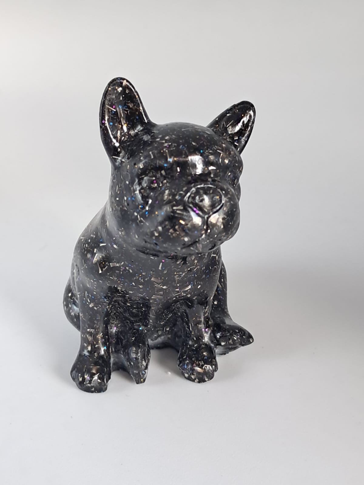 Electronite en formato de Bulldog francés. Mide 6,5cm de altura por 3,7 cm de ancho. compuesta de viruta de aluminio, cuarzo natural, termoretráctil, sal de Rochelle o Tartrato de Potasio y Sodio Tetrahidratado, pigmento para resina y resina poliéster.