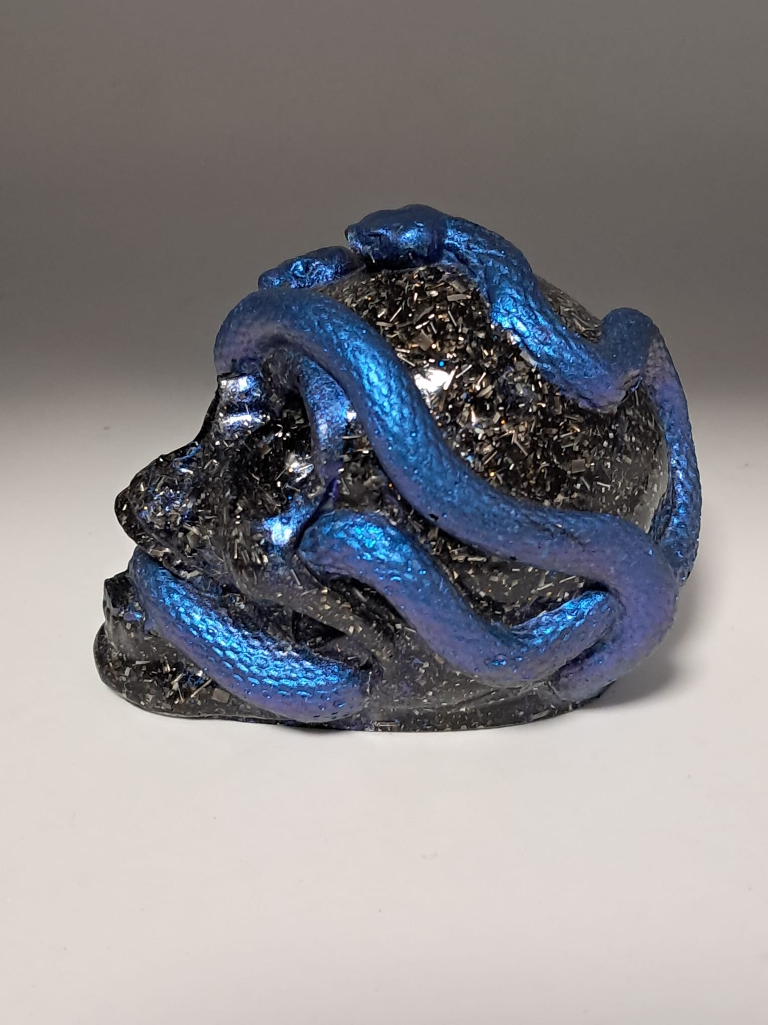 Electronite en forma de calavera con serpiente pigmentada. Mide 7 cm de alto, por 9 cm de largo por 6,5 cm de ancho. Esta electronite está compuesta de viruta de aluminio, cuarzos naturales, termoretráctil, sal de Rochelle o Tartrato de Potasio y Sodio Tetrahidratado, pigmentos para resina y resina poliéster.