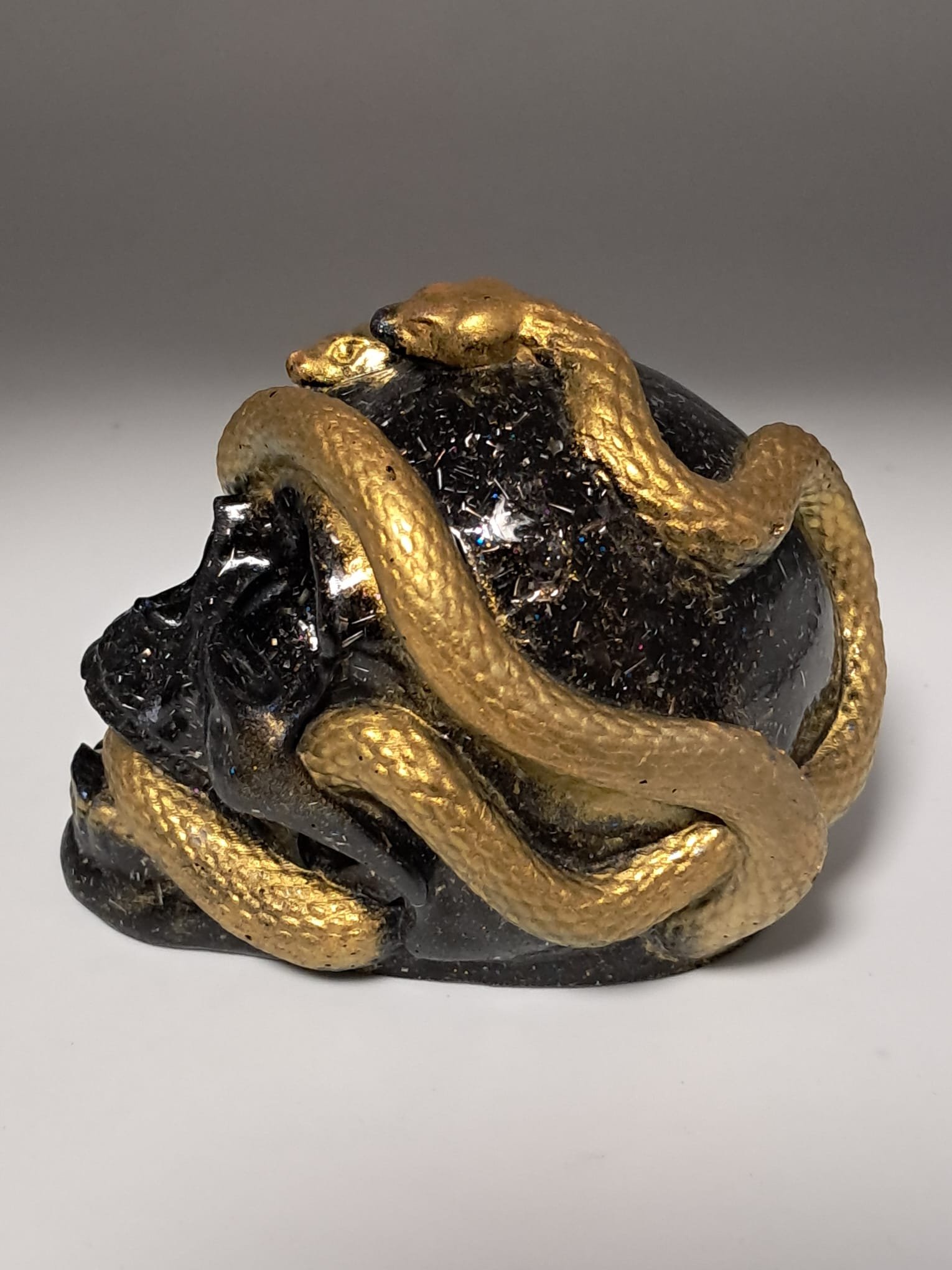 Electronite en forma de calavera con serpiente pigmentada. Mide 7 cm de alto, por 9 cm de largo por 6,5 cm de ancho. Esta electronite está compuesta de viruta de aluminio, cuarzos naturales, termoretráctil, sal de Rochelle o Tartrato de Potasio y Sodio Tetrahidratado, pigmentos para resina y resina poliéster.