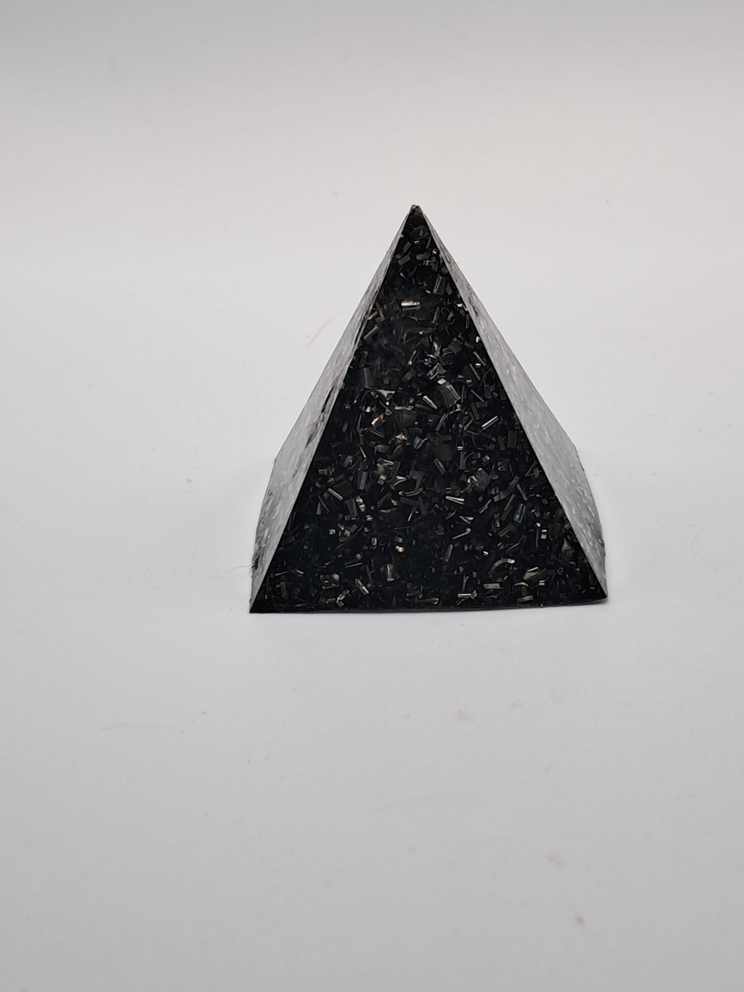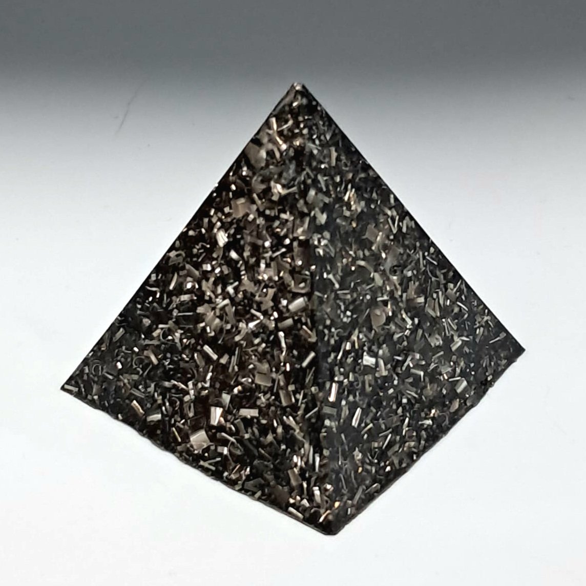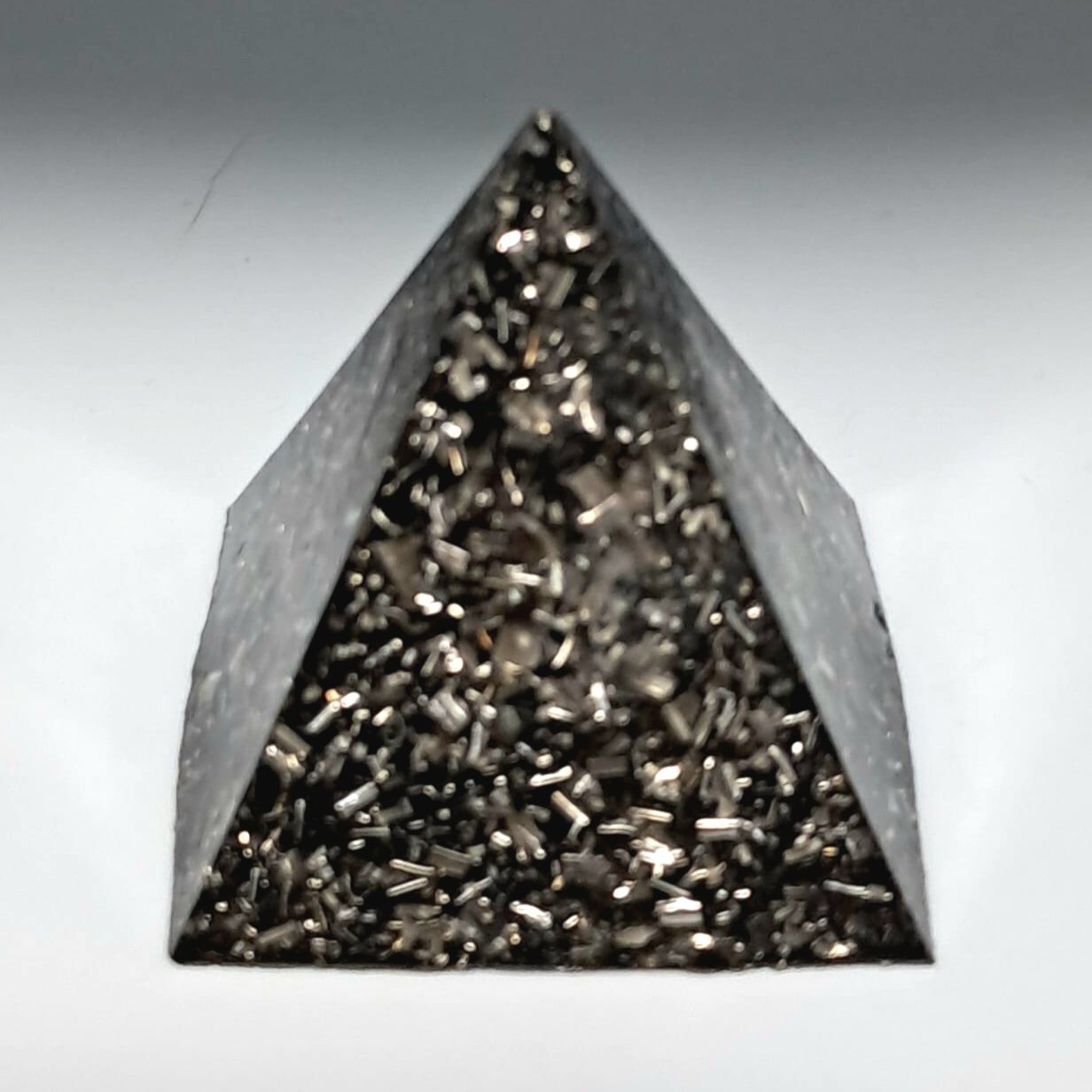 Orgonita en formato de pirámide pequeña. Mide 5x5cm y tiene un peso aproximado de 60-70gr. Compuesto de aluminio, cuarzos, shungita y resina orgánica. Colócala cerca de una fuente de electricidad. Ideal para la mesilla de noche.